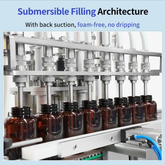 Il riempimento a immersione è una delle sue caratteristiche principali. Durante il processo di riempimento, la testa di riempimento viene sempre mantenuta al di sotto del livello del liquido. Questo design risolve in modo intelligente il problema della formazione di schiuma e degli schizzi di liquido. Per alcuni liquidi facilmente schiumosi, come i liquidi contenenti tensioattivi e alcuni liquidi orali, il metodo di riempimento tradizionale prevede il riempimento al di sopra del livello del liquido, causando un contatto violento tra il liquido e l'aria, con conseguente formazione di un gran numero di bolle. Queste bolle non solo occupano lo spazio del contenitore, compromettendo la precisione del volume di riempimento, ma possono anche traboccare, causando sprechi di liquido e inquinamento delle apparecchiature. Tuttavia, con il riempimento a immersione, poiché la testa di riempimento scende in profondità al di sotto del livello del liquido, il liquido può essere iniettato senza problemi nel contenitore, riducendo notevolmente il contatto con l'aria e inibendo sostanzialmente la formazione di bolle. Allo stesso tempo, evita anche che il liquido fuoriesca dal contenitore a causa dell'impatto, riducendo ulteriormente la perdita di liquido.